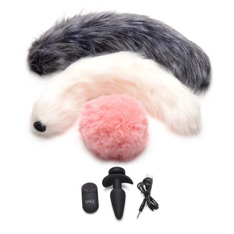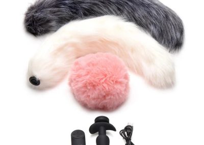 Set the vibe and let your wild side come out to play with these animal tails! This set comes with 3 different tail attachments and a vibrating, silicone anal plug that is compatible with each tail. Enjoy switching between a pink rabbit tail, a gray fox tail and a white fox tail. Mix and match with your other accessories and outfits to make into a costume.